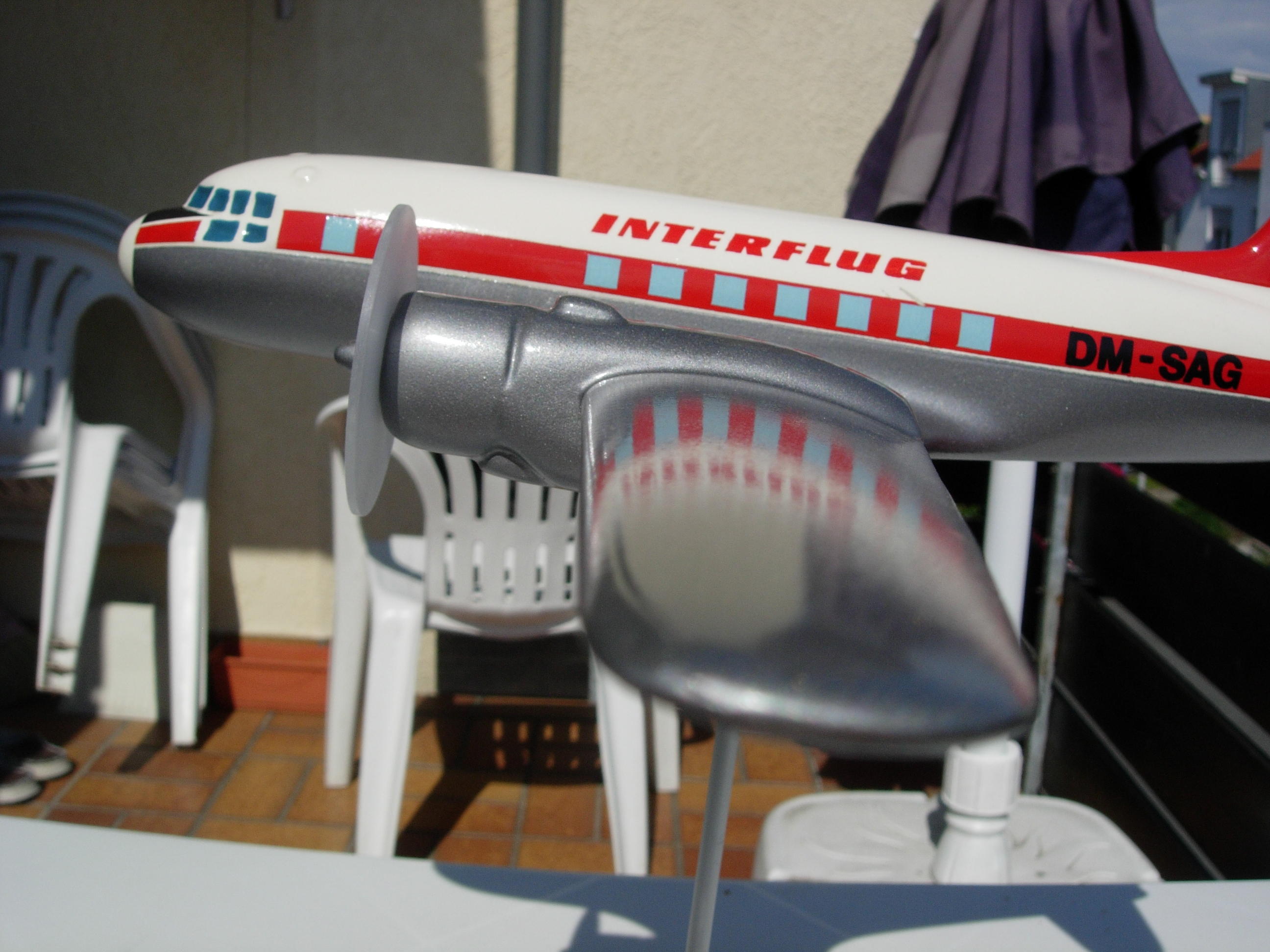 | A masterpiece made out of Aluminium in the impressive scale 1:50 in the colours of East German INTERFLUG. The details of her origin are unknown. There is no mistake that the model must have been exhibited in a town office of INTERFLUG or a travel agency probably in the 60s. When purchased, the model was only equipped with card board propellers, which must have been attached by the previous owner. In the meantime the model has been reconstructed together with her big sister – the INTERFLUG IL-18 – and equipped with plexiglass propellers. Also, a new stand needed to be manufactured. |