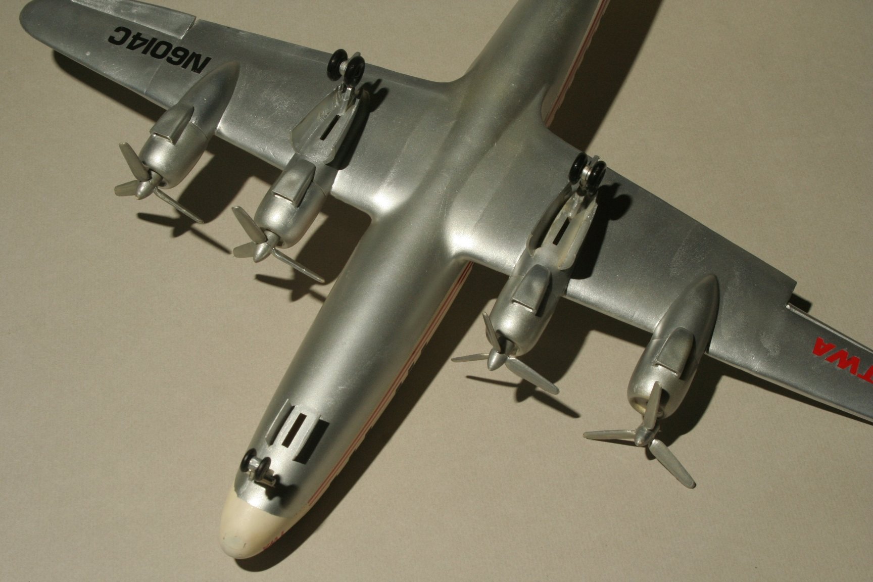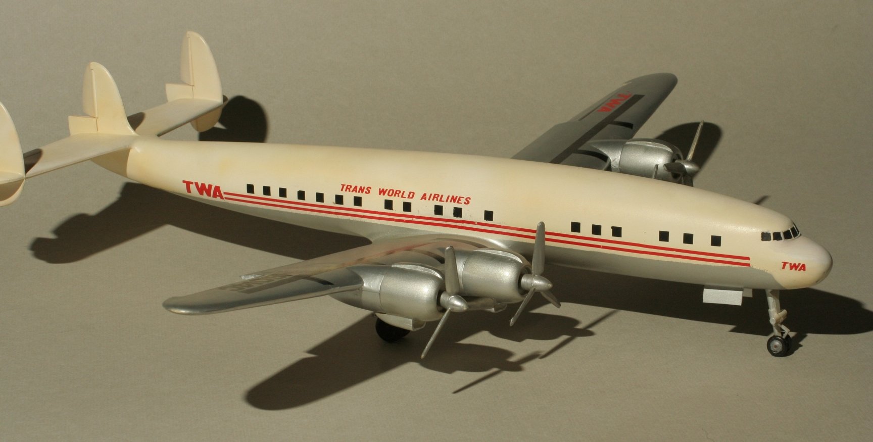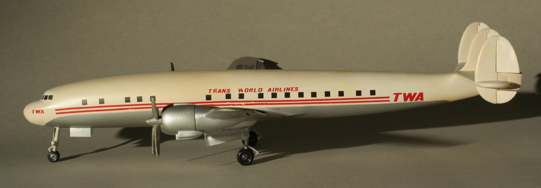 Das Modell wurde nicht mit den original Decals gebaut sondern in der Ausführung TWA TRANS WORLD AIRLINES, vorwiegend mit Anreibebuchstaben.