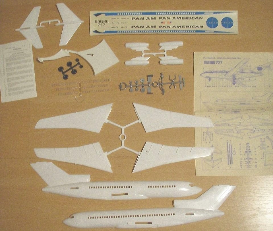 PAN AM Boeing 727 Einzelteile des Bausatzes, Packzettel, Decals und Bauanleitung. Die Einzelteile sind identisch zu den in der Plasticart Verpackung vertriebenen Bausätzen.